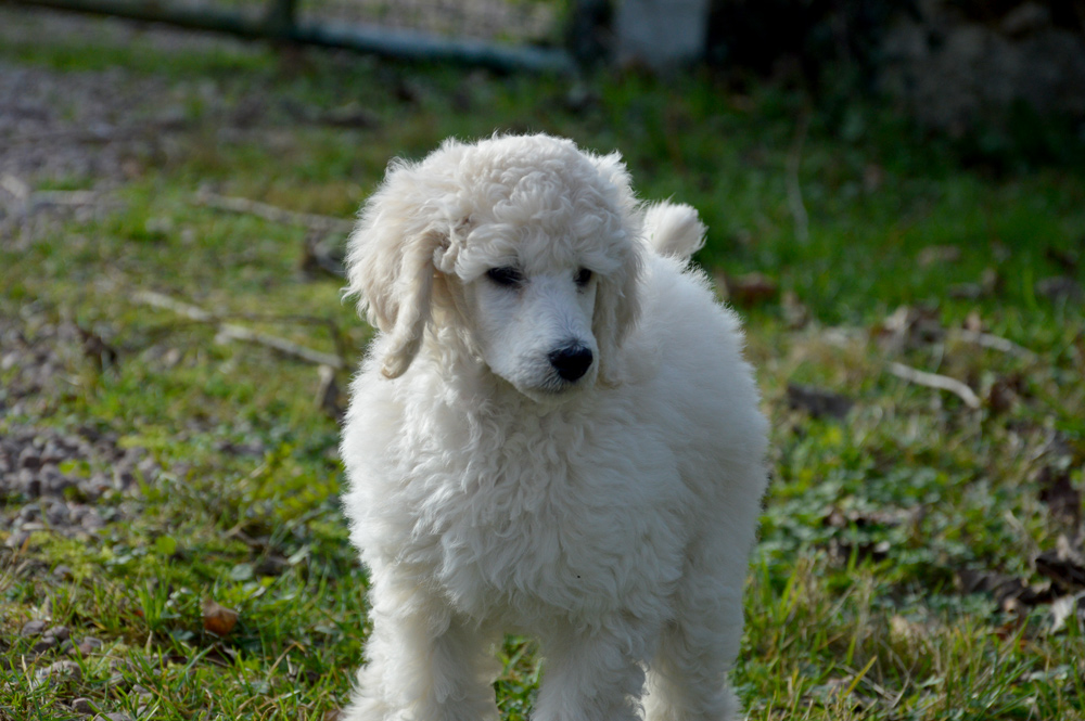Elle grandit aux côtés des deux sœurs caniches Sia et Sheryl ainsi que de Pléthore, loup de Saarloos. Cette cohabitation favorise l’apprentissage des codes sociaux canins et le développement de sa capacité d’ajustement.